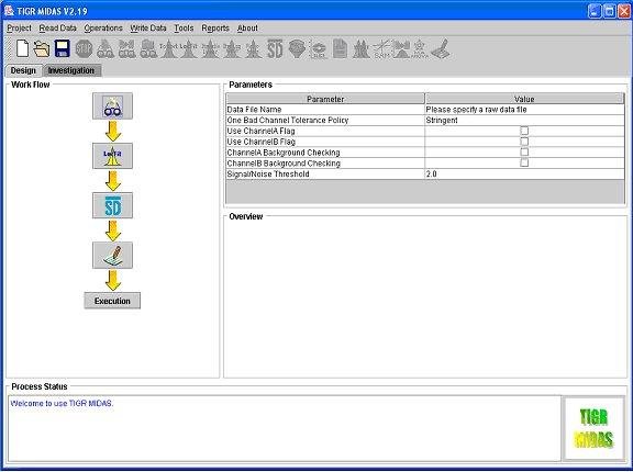 Microarray Data Analysis System, a Java application, provides an intuitive graphical scripting interface to design analysis protocols and perform normalization and filtering to microarray data by a variety of implemented statistical analysis modules.