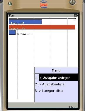 MobileExpenseTracker is a small J2ME MIDlet (MIDP) to track expenses on a mobile. The expenses can be grouped by categories, sums are available. The expense data can be exported to a PC and stored in a CSV file to be used in some spread sheet.