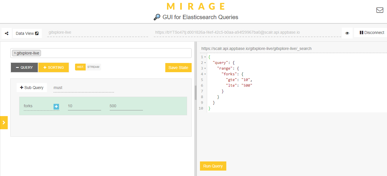 The Elasticsearch query DSL supports 100+ query APIs ranging from full-text search, numeric range filters, and geolocation queries to nested and span queries. Mirage is a modern, open-source web-based query explorer for Elasticsearch. It offers a blocks-based GUI for composing Elasticsearch queries and comes with an on-the-fly transformer to show the corresponding JSON query API of Elasticsearch. Queries can be saved for later reuse. They can also be captured and shared by copying the URL. Mirage works with any Elasticsearch 2. x, 5. x, 6. x, and 7.x index currently. Below is the roadmap for query support. Every app in appbase.io has a query explorer view, which uses mirage. Mirage can be used along with ⊞ DejaVu to browse data and perform CRUD operations inside an Elasticsearch index.