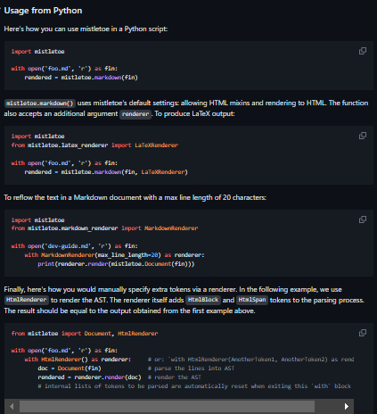 mistletoe is a Markdown parser in pure Python, designed to be fast, spec-compliant and fully customizable. Apart from being the fastest CommonMark-compliant Markdown parser implementation in pure Python, mistletoe also supports easy definitions of custom tokens. Parsing Markdown into an abstract syntax tree also allows us to swap out renderers for different output formats, without touching any of the core components.