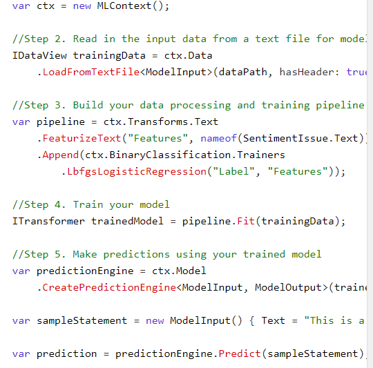 ML.NET is a cross-platform open-source machine learning framework that makes machine learning accessible to .NET developers. In this GitHub repo, we provide samples that will help you get started with ML.NET and how to infuse ML into existing and new .NET apps. We're working on simplifying ML.NET usage with additional technologies that automate the creation of the model for you so you don't need to write the code by yourself to train a model, you simply need to provide your datasets. The "best" model and the code for running it will be generated for you. The ML.NET CLI (command-line interface) is a tool you can run on any command prompt (Windows, Mac or Linux) for generating good quality ML.NET models based on training datasets you provide. In addition, it also generates sample C# code to run/score that model plus the C# code that was used to create/train it so you can research what algorithm and settings it is using.
