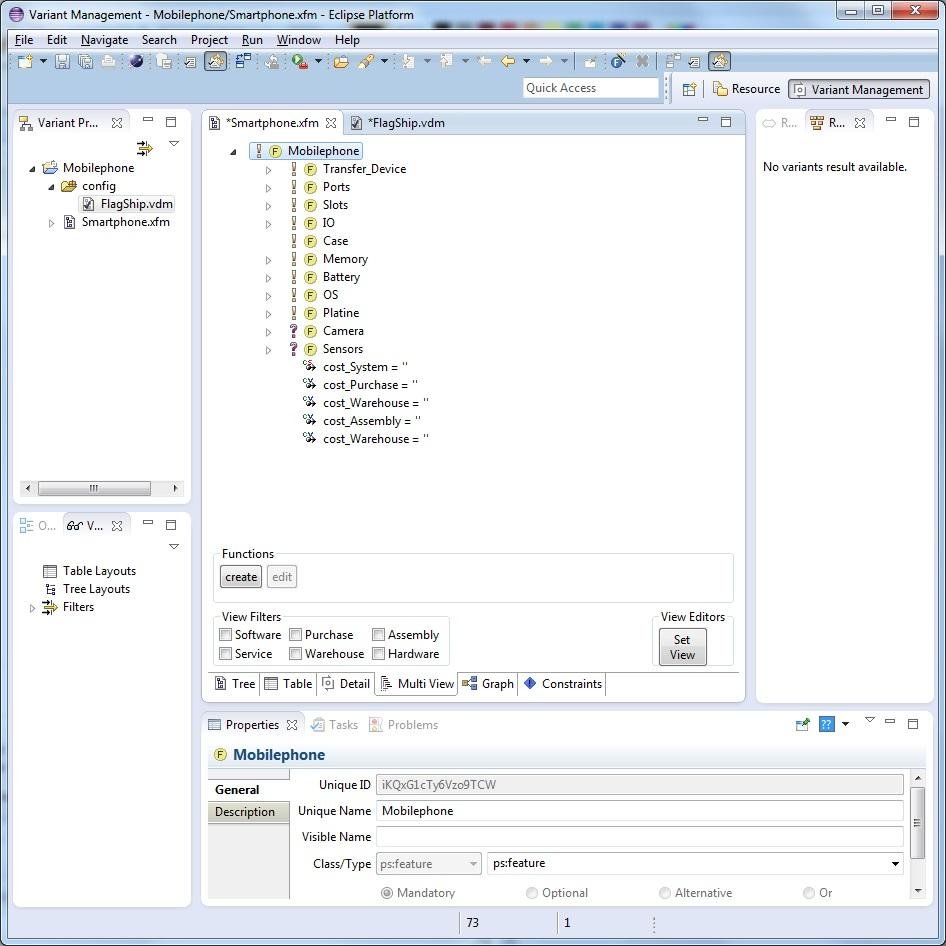MVE extends the feature and variant editor of the pure::variant plugin. You can assign and filter each feature and attribute to a specific kind of view you want to work with.