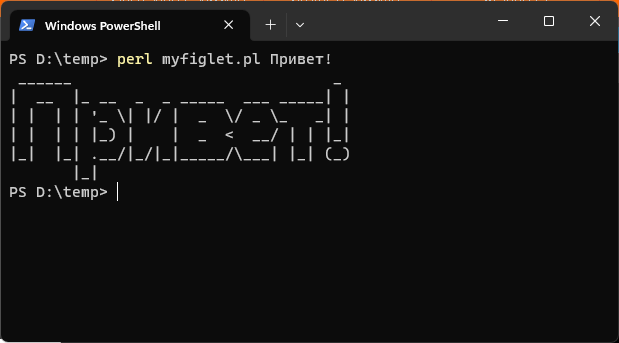 This program is a simple analog of FIGlet[1,2,3] program. It has only one font, but can operate with Cyrillic letters. This program accepts CP1251 encoding. It is written in Perl.