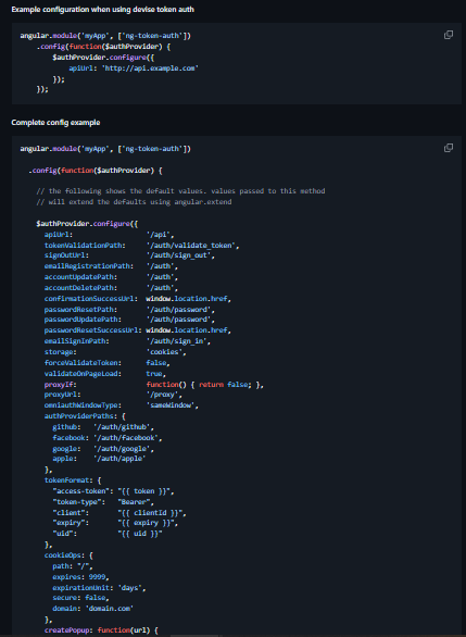 ng‑token‑auth is an AngularJS module that provides token-based authentication for single-page applications by coordinating with server-side token systems like the devise_token_auth gem. Oauth2 authentication. Email authentication, including user registration. Password reset, account updates, account deletion, seamless integration with the devise token auth Rails gem, and extensive event notifications. This module relies on token based authentication. This requires coordination between the client and the server. Diagrams are included to illustrate this relationship.