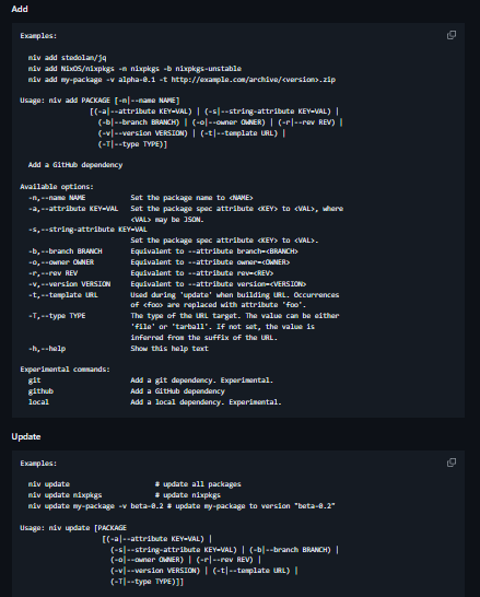 Niv is a tool designed for managing dependencies in Nix projects. It simplifies adding, updating, and removing package sources via a single nix/sources.json file, improving reproducibility and version control in Nix-based workflows. niv simplifies adding and updating dependencies in Nix projects. It uses a single file, nix/sources.json, where it stores the data necessary for fetching and updating the packages. Nix is a very powerful tool for building code and setting up environments. niv complements it by making it easy to describe and update remote dependencies (URLs, GitHub repos, etc). It is a simple, practical alternative to Nix flakes. The add command will infer information about the package being added, when possible. This works very well for GitHub repositories. Run this command to add jq to your project.