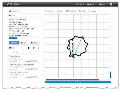 Control and monitor every aspect of your 3D printer and your printing jobs right from within your browser. OctoPrint's powerful plugin system allows extending its functionality with awesome plugins from the community. Free and open source software released under the Affero General Public License (AGPL). Control and monitor every aspect of your 3D printer and your printing jobs right from within your browser. Access the embedded webcam feed and watch remotely how your printer is creating your newest thing. Get constant feedback regarding the current progress of your print job. Take a look at the integrated GCODE visualizer to see a rendition of the GCODE you are currently printing. Keep an eye on the temperatures of your hotends and print bed and adapt them on the fly. Move the print head along all axes, extrude, retract or just define your own custom controls.