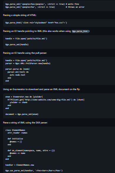 Oga is an XML/HTML parser written in Ruby. Oga is an XML/HTML parser written in Ruby. It provides an easy-to-use API for parsing, modifying and querying documents (using XPath expressions). Oga does not require system libraries such as libxml, making it easier and faster to install on various platforms. To achieve better performance Oga uses a small, native extension (C for MRI/Rubinius, Java for JRuby). Oga provides an API that allows you to safely parse and query documents in a multi-threaded environment, without having to worry about your applications blowing up. Oga uses the version format MAJOR.MINOR (e.g. 2.1). An increase of the MAJOR version indicates backwards incompatible changes were introduced. The MINOR version is only increased when changes are backwards compatible, regardless of whether those changes are bugfixes or new features. Up until version 1.0 the code should be considered unstable meaning it can change (and break) at any given moment.