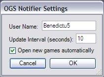 OGS Notifier is a utility for Go players. It sits in your windows tray bar and lets you know if there are any games on the Online Go Server where it is your turn to play. Actually it is a port of Dragon Notifier to OGS.