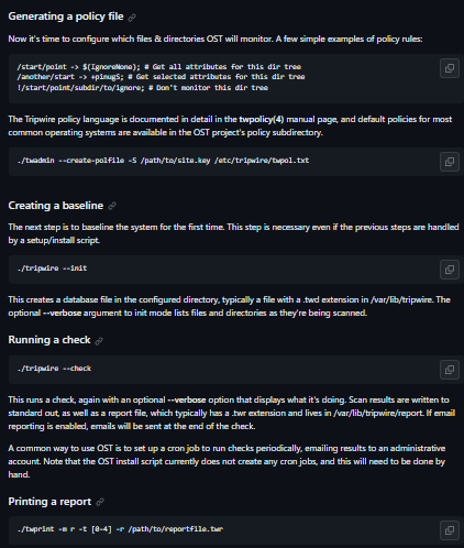 Open Source Tripwire® is a security and data integrity tool for monitoring and alerting on file & directory changes. This project is based on code originally contributed by Tripwire, Inc. in 2000. A Tripwire check compares the current filesystem state against a known baseline state, and alerts on any changes it detects. The baseline and check behavior are controlled by a policy file, which specifies which files or directories to monitor, and which attributes to monitor them, such as hashes, file permissions, and ownership. When an expected change occurs, such as upgrading a package, the baseline database can be updated to the new known-good state. The policy can also be updated, for example, to reduce noise or cover a newly installed package.