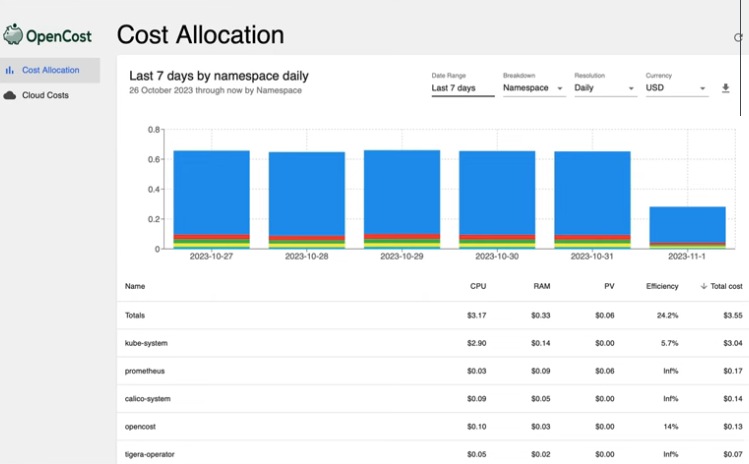 - Real-time cost allocation by Kubernetes cluster, node, namespace, controller kind, controller, service, or pod