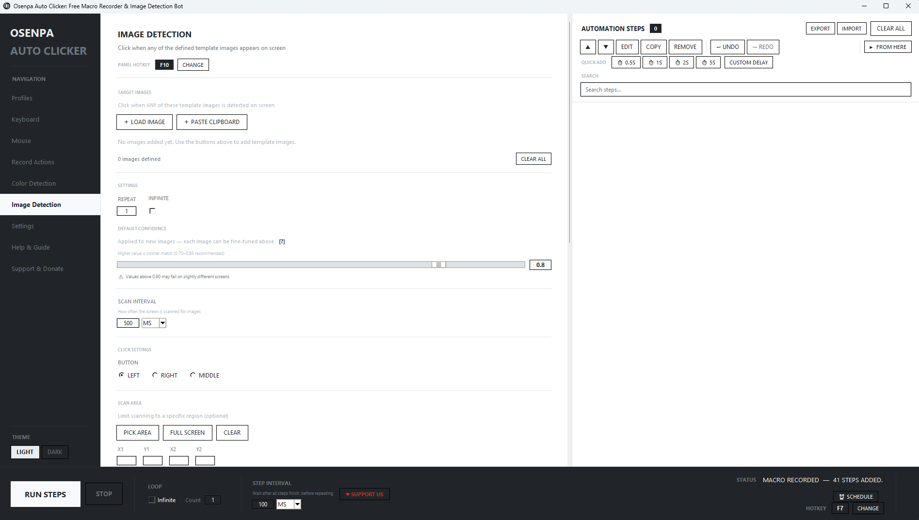 It combines auto clicking, macro recording, keyboard automation, image detection, and color detection in a single GUI application. Users can build step-based automation flows, save and load profiles, assign hotkeys, and run a packaged Windows executable without installing Python.