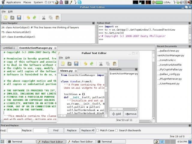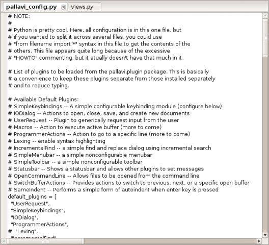 Pallavi is a fully customizeable text editor. It is designed to have an extremely flexible plugin and macro mechanism to allow easy extension by programmers and end users alike. This allows the editor to range, according to the user's preference, from a