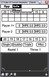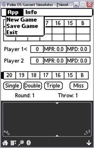 Palm OS score keeper for the dart game Cricket. Written in PocketC. Supports 2 players and allows game to be saved as a memo to be HotSync'd. Keep track of marks per round/dart dart and points scored. Shows darts thrown and current round.
