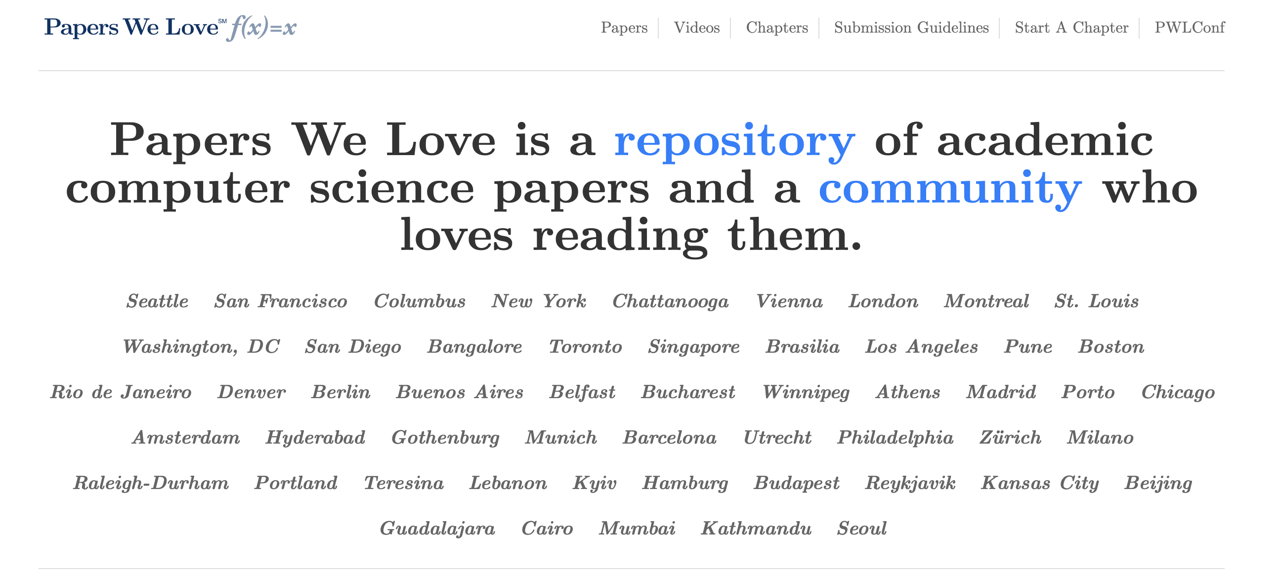 Papers We Love (PWL) is a global open source community dedicated to reading, discussing, and sharing influential computer science research papers. The repository serves as a curated directory of academic papers that have shaped the field of computing, providing a centralized location for documents that were previously scattered across various online sources. While licensing restrictions prevent hosting all papers directly, PWL offers links to their original sources and clearly marks hosted copies with an emoji. The community encourages participation through local meetups, where members gather to discuss and analyze key works spanning topics such as programming languages, distributed systems, and software engineering. In addition to the repository, Papers We Love maintains an active Discord server and YouTube channel, fostering ongoing dialogue around the ideas and applications found in computer science literature. Contributions are welcome.