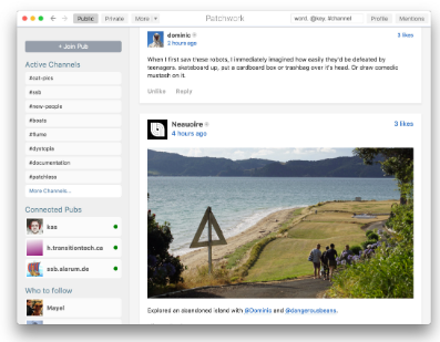 A decentralized messaging and sharing app built on top of Secure Scuttlebutt (SSB). Connect with friends without depending on any central servers. Don't worry about spam, you only get messages from people you follow. Use Patchwork online or offline, the data you need is stored on your device. Sync messages with friends when you're on the same Wi-Fi network. Keep secrets with private messages, which are always end-to-end encrypted. Change and improve Patchwork however you'd like, it's free and open source.