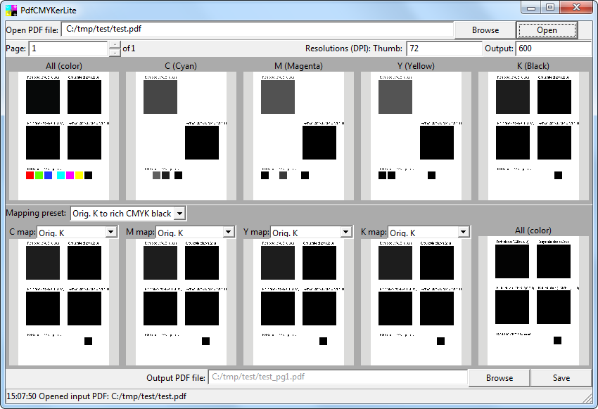 PdfCMYKerLite is a wxPython GUI front-end for Ghostscript `gs` and ImageMagick `convert`, which uses the Ghostscript tiffsep device to obtain CMYK separations of a PDF document. For full description, see README.md in the code browser at https://sourceforge.net/p/pdfcmykerlite/code/ci/master/tree/