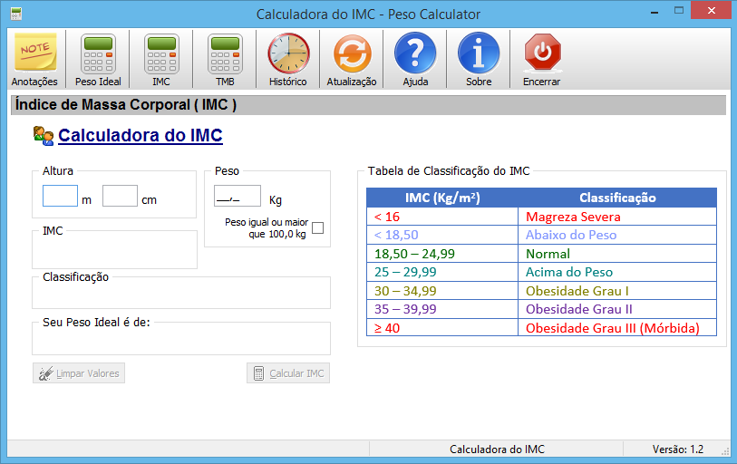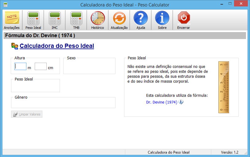 Peso Calculator calcula e monitora de forma simples o seu Peso Ideal a partir da fórmula do Dr. Devine (1974) e Índice de Massa Corporal. Calcula também quantidade de energia que você gasta por dia quando em repouso pela Taxa Metabólica Basal ( TMB). É possível salvar os resultados do IMC para acompanhamento posterior e ver se engordou ou emagreceu. Recursos: Faz o cálculo do Peso Ideal através da fórmula Dr. Devine (1974); Faz o cálculo do Índice de Massa Corportal (IMC) de acordo com a Organização Mundial de Saúde; Faz o cálculo da Taxa Metabólica Basal (TMB) pela Equação de Harris Benedict onde é usada para obter o gasto calórico basal diário.