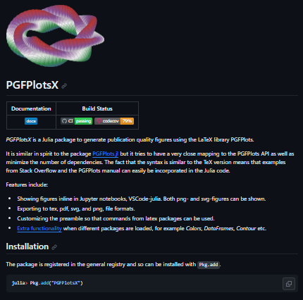 PGFPlotsX is a Julia package to generate publication quality figures using the LaTeX library PGFPlots. It is similar in spirit to the package PGFPlots.jl but it tries to have a very close mapping to the PGFPlots API as well as minimize the number of dependencies. The fact that the syntax is similar to the TeX version means that examples from Stack Overflow and the PGFPlots manual can easily be incorporated in the Julia code.