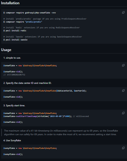 An ID Generator for PHP based on Snowflake Algorithm (Twitter announced). Snowflake is a network service that generates unique ID numbers at high scale with simple guarantees. If you want to generate unique IDs using the snowflake algorithm, you must ensure that sequence numbers generated within the same millisecond on the same node are unique. Based on this requirement, we have created this package which integrates multiple sequence number providers.