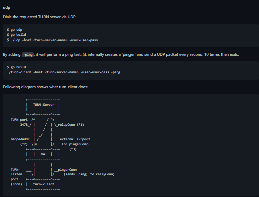 Pion TURN is a Go toolkit for building TURN servers and clients. We wrote it to solve problems we had when building RTC projects. Deployable - Use modern tooling of the Go ecosystem. Stop generating config files. Embeddable - Include pion/turn in your existing applications. No need to manage another service. Extendable - TURN as an API so you can easily integrate with your existing monitoring and metrics. Maintainable - pion/turn is simple and well documented. Designed for learning and easy debugging. Portable - Quickly deploy to multiple architectures/platforms just by setting an environment variable. Safe - Stability and safety is important for network services. Go provides everything we need. Scalable - Create allocations and mutate state at runtime. Designed to make scaling easy. pion/turn is an API for building STUN/TURN clients and servers, not a binary you deploy then configure.