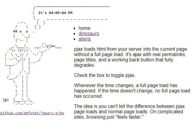 pjax loads html from your server into the current page without a full page load. It's ajax with real permalinks, page titles, and a working back button that fully degrades. Check the box to toggle pjax. Whenever the time changes, a full page load has happened. If the time doesn't change, no full page load has occurred. The idea is you can't tell the difference between pjax page loads and normal page loads. On complicated sites, browsing just "feels faster." pjax is a jQuery plugin that uses ajax and pushState to deliver a fast browsing experience with real permalinks, page titles, and a working back button. pjax works by fetching HTML from your server via ajax and replacing the content of a container element on your page with the loaded HTML. It then updates the current URL in the browser using pushState.