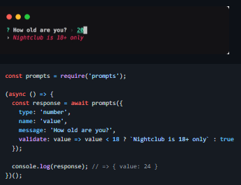 prompts has no big dependencies nor is it broken into a dozen tiny modules that only work well together. prompt uses layout and colors to create beautiful cli interfaces. prompts uses promises and async/await. No callback hell. All prompts are independent and can be used on their own. Provides a way to submit answers programmatically. Consistent experience across all prompts. Prompt with a single prompt object. Returns an object with the response. Prompt with a list of prompt objects. Returns an object with the responses. Make sure to give each prompt a unique name property to prevent overwriting values. Prompt properties can be functions too. Prompt Objects with type set to falsy values are skipped. Prompter function which takes your prompt objects and returns an object with responses. Prompts can be submitted (return, enter) or canceled (esc, abort, ctrl+c, ctrl+d). No property is being defined on the returned response object when a prompt is canceled.