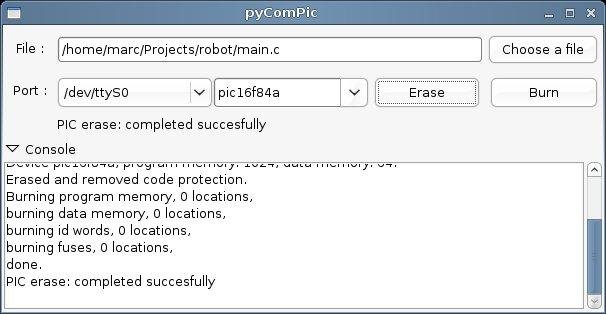 pyComPic is a GUI (Graphical User Interface) for picprog, sdcc and gpasm written in Python. It uses pyGTK and GTK2 for the interface. It's a good choice if you want to avoid the command line. It works with all PIC programmers supported by picprog
