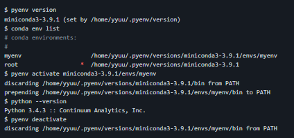 pyenv-virtualenv is a pyenv plugin that provides features to manage virtual environments and conda environments for Python on UNIX-like systems. If you installed pyenv into a non-standard directory, make sure that you clone this repo into the 'plugins' directory of wherever you installed into. macOS users can install pyenv-virtualenv with the Homebrew package manager. This will give you access to the pyenv-virtualenv command. If you have pyenv installed, you will also be able to use the pyenv virtualenv command. There is a venv module available for CPython 3.3 and newer. It provides an executable module venv which is the successor of virtualenv and distributed by default. You can use version like miniconda3-3.9.1/envs/myenv to specify conda environment as a version in pyenv.