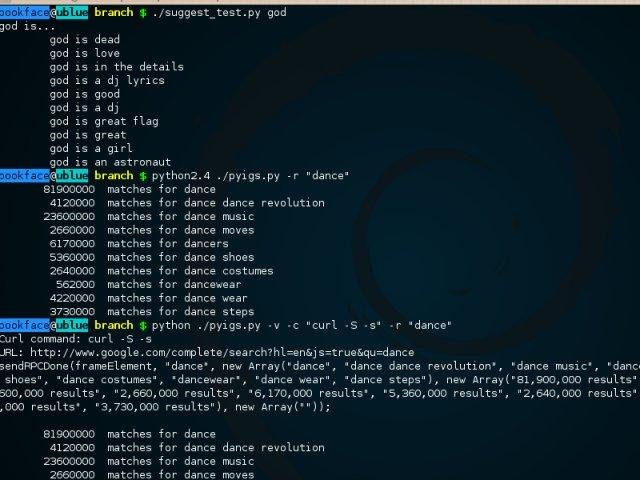 PYIGS is a Python package that provides an interface to Google! Suggest results. It may be run standalone or incorporated as a module.