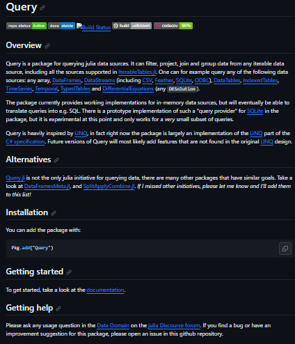 - Query is an almost complete implementation of the query expression section of the C# specification, with some additional julia specific features added in