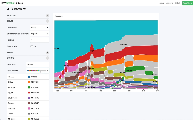 Inspired by and built on top of open-source projects. RAWGraphs is open to the community for contributions. Almost 30 visual models to visualize quantities, hierarchies, and time series and find insights in your data. Even though RAWGraphs is a web app, the data you insert will be processed only by your web browser. Save your project, or export it as a vector or raster image. Edit it within your favorite software. RAWGraphs is an open source data visualization framework built with the goal of making the visual representation of complex data easy for everyone. Primarily conceived as a tool for designers and vis geeks, RAWGraphs aims at providing a missing link between spreadsheet applications (e.g. Microsoft Excel, Apple Numbers, OpenRefine) and vector graphics editors (e.g. Adobe Illustrator, Inkscape, Figma). The project, led and maintained by the DensityDesign Research Lab (Politecnico di Milano) was released publicly in 2013.