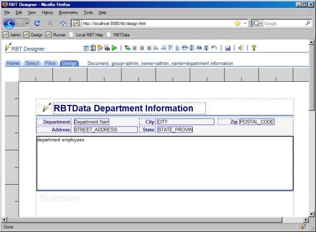 User-friendly, browser-based sql query and report design application backed by scalable J2EE technology. RBT includes a feature-rich HTML design toolset and provides support for drill down reports, sub reports, Excel and PDF export and RSS feeds.