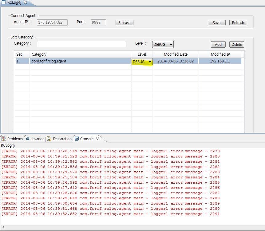 4.RCLog4j Client는 Eclipse plugin으로 배포되어 Agent와 JMX통신을 하며 Runtime환경에서 Log Category를 등록하고 Log Level을 조절할 수 있다.