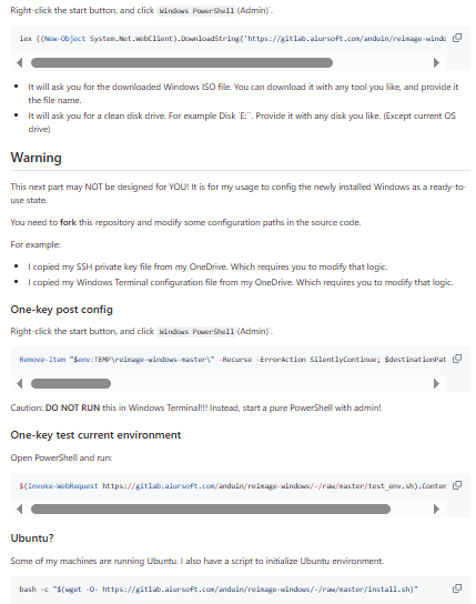 Reimage-Windows is a repo for automating and documenting the process of reinstalling or “reimaging” Windows, turning what is normally a manual, error-prone chore into a repeatable pipeline. It bundles scripts, configuration, and notes so that after a clean Windows install you can run one or two commands to get your environment back. The project is aimed at people who rebuild machines often, maintain several PCs, or just want a disaster-recovery style setup for Windows. It encourages treating OS setup like code: versioned, reviewable, and improvable over time. Because it’s public, you can see exactly what’s being installed and customize it for your own drivers, packages, and tools. The end goal is a faster path from “blank Windows” to “fully set up workstation” with minimal clicks.