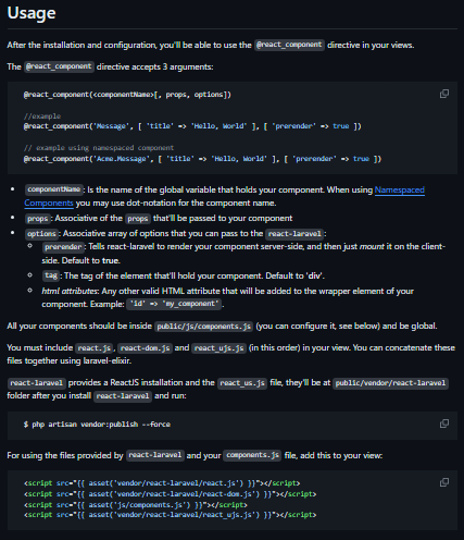 With react-laravel you'll be able to use ReactJS components right from your Blade views, with optional server-side rendering, and use them on the client-side with React due to unobtrusive JavaScript.