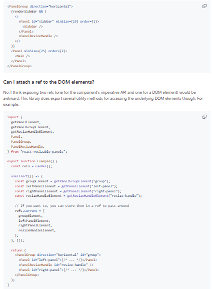 react-resizable-panels provides accessible, flexible split-view layouts for React without wrestling low-level pointer math yourself. It models layouts as “groups” of panels separated by resize handles, supporting horizontal or vertical orientation and mixed min/max constraints that prevent panels from collapsing unexpectedly. The library focuses on smooth interactions: dragging, double-clicking to reset, and keyboard resizing for users who rely on accessibility features. It also supports snapping, collapsed states, and layout persistence so your app can remember user preferences between sessions. Because the API is component-based, you can nest groups, render custom panel contents, and style handles to match your design system. Under the hood, it keeps measurement logic reliable across reflows and React 18 rendering patterns, making it suitable for IDE-like UIs, data dashboards, and inspector panes.