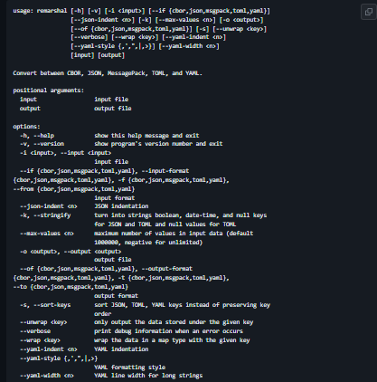 Convert between CBOR, JSON, MessagePack, TOML, and YAML. When installed, provides the command-line command remarshal as well as the short commands {cbor,json,msgpack,toml,yaml}2{cbor,json,msgpack,toml,yaml}. You can perform format conversion, reformatting, and error detection using these commands. CBOR, MessagePack, and YAML with binary fields cannot be converted to JSON or TOML. Binary fields are converted between CBOR, MessagePack, and YAML.
