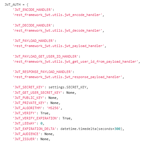JSON Web Token Authentication support for Django REST Framework. This package provides JSON Web Token Authentication support for Django REST framework. Unlike some more typical uses of JWTs, this module only generates authentication tokens that will verify the user who is requesting one of your DRF protected API resources. The actual request parameters themselves are not included in the JWT claims which means they are not signed and may be tampered with. You should only expose your API endpoints over SSL/TLS to protect against content tampering and certain kinds of replay attacks. You can easily test if the endpoint is working by doing the following in your terminal, if you had a user created with the username admin and password password123. Alternatively, you can use all the content types supported by the Django REST framework to obtain the auth token.