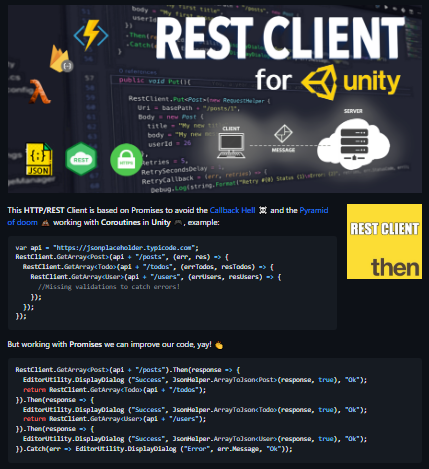 A Promise-based REST and HTTP client for Unity. Works out of the box. Make HTTP requests from Unity. Supports HTTPS/SSL. Built on top of UnityWebRequest system. Transform request and response data (JSON serialization with JsonUtility or other tools) Automatic transforms for JSON Arrays. Supports default HTTP Methods (GET, POST, PUT, DELETE, HEAD, PATCH) Generic REQUEST method to create any http request. Based on Promises for better asynchronous programming. Learn about Promises here! Utility to work during a scene transition. Handle HTTP exceptions and retry requests easily.
