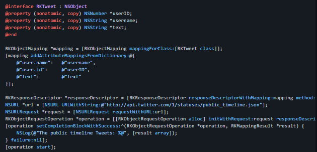 RestKit is a modern Objective-C framework for implementing RESTful web services clients on iOS and Mac OS X. It provides a powerful object mapping engine that seamlessly integrates with Core Data and a simple set of networking primitives for mapping HTTP requests and responses built on top of AFNetworking. It has an elegant, carefully designed set of APIs that make accessing and modeling RESTful resources feel almost magical. You can even access the Twitter public timeline and turn the JSON contents into an array of Tweet objects. RestKit is designed to be modular and each module strives to maintain a minimal set of dependencies across the framework and with the host platform. At the core of library sits the object mapping engine, which is responsible for transforming objects between representations (such as JSON/XML <-> local domain objects). The object mapping engine is built on top of the Key-Value Coding (KVC) informal protocol.