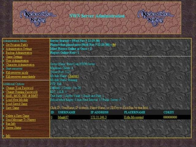 Web interface for managing Never Winter Night servers. This interface provides many features for monitoring and controlling multiple servers on the same computer. The interface provides support for nwnx and has an interface for running database queries.