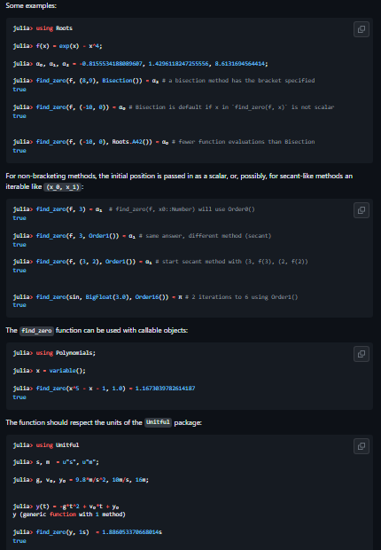 This package contains simple routines for finding roots, or zeros, of scalar functions of a single real variable using floating-point math. The find_zero function provides the primary interface. The basic call is find_zero(f, x0, [M], [p]; kws...) where, typically, f is a function, x0 a starting point or bracketing interval, M is used to adjust the default algorithms used, and p can be used to pass in parameters. Bisection-like algorithms. For functions where a bracketing interval is known (one where f(a) and f(b) have alternate signs), a bracketing method, like Bisection, can be specified. The default is Bisection, for most floating point number types, employed in a manner exploiting floating point storage conventions. For other number types (e.g. BigFloat), an algorithm of Alefeld, Potra, and Shi is used by default. These default methods are guaranteed to converge. Other bracketing methods are available.