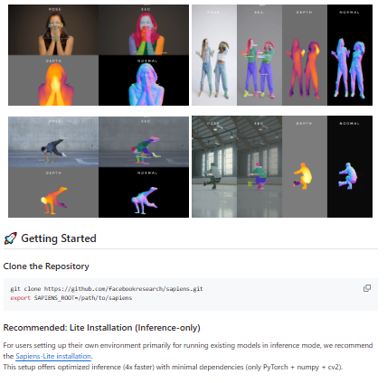 Sapiens is a research framework from Meta AI focused on embodied intelligence and human-like multimodal learning, aiming to train agents that can perceive, reason, and act in complex environments. It integrates sensory inputs such as vision, audio, and proprioception into a unified learning architecture that allows agents to understand and adapt to their surroundings dynamically. The project emphasizes long-horizon reasoning and cross-modal grounding—connecting language, perception, and action into a single agentic model capable of following abstract goals. It includes simulation environments, datasets, and benchmarks for testing grounded understanding, imitation learning, and decision-making. The system’s modular pipeline supports both imitation-based and reinforcement-based training strategies, allowing flexible experimentation with different embodiments and tasks.