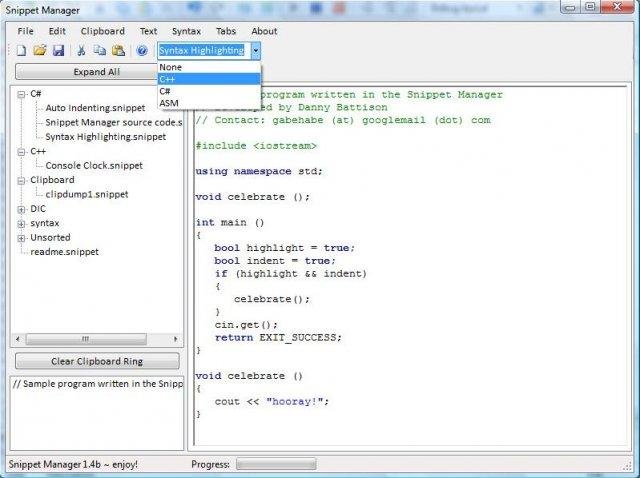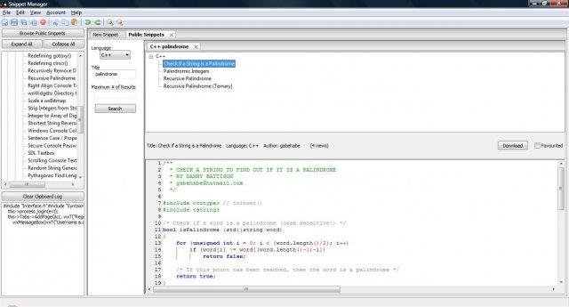 This program is a snippet repository, in which the user can store snippets in various languages both locally and online. Key features include syntax highlighting, clipboard logging, tabbed editing, share & favourite snippets! http://snippets.gabehabe.com