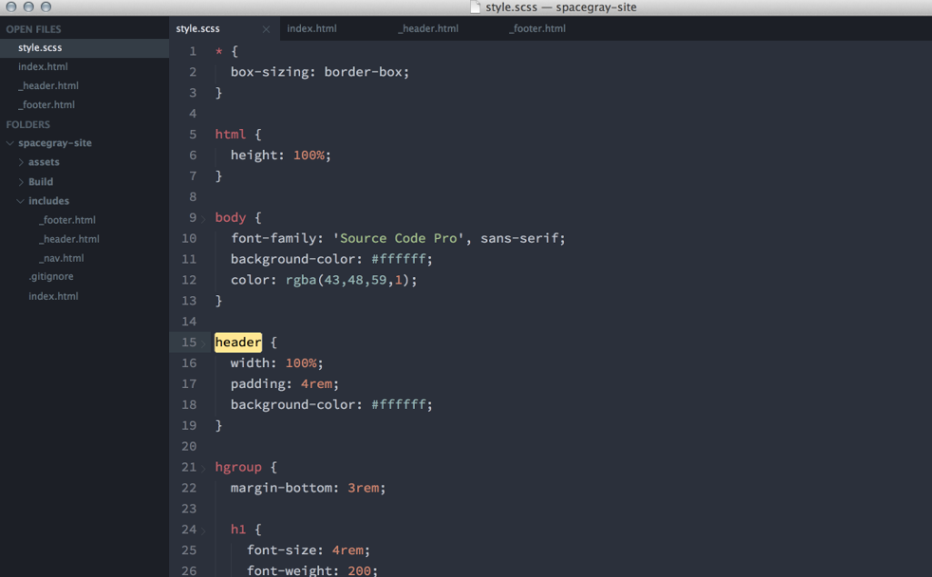A set of custom UI themes for Sublime Text 2/3. It's all about hype and minimal. Comes in different flavors with accompanying Base16 color schemes. Default flavor based on Base16 Ocean Dark color scheme. The easiest way to install is using Sublime Package Control, where Spacegray is listed as Theme - Spacegray. Activate the UI theme and color scheme by modifying your user preferences file, which you can find using the menu item Sublime Text -> Preferences -> Settings - User (⌘, on Mac). You can choose whichever flavor you like, but don't forget to change both color scheme and UI theme so they match.