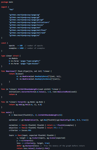 A Machine Learning library written in pure Go designed to support relevant neural architectures in Natural Language Processing. Spago is self-contained, in that it uses its own lightweight computational graph both for training and inference, easy to understand from start to finish. The core module of Spago relies only on testify for unit testing. In other words, it has "zero dependencies", and we are committed to keeping it that way as much as possible. Spago uses a multi-module workspace to ensure that additional dependencies are downloaded only when specific features (e.g. persistent embeddings) are used. A good place to start is by looking at the implementation of built-in neural models, such as the LSTM. Except for a few linear algebra operations written in assembly for optimal performance (a bit of copying from Gonum), it's straightforward Go code, so you don't have to worry.