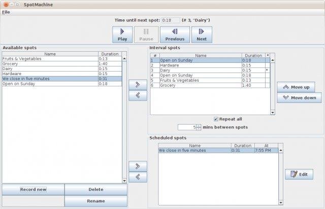 A program to record and sequentially play audio spots in e.g. supermarkets.