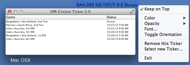An unobtrusive ticker that displays the latest score for one or more international cricket matches covering test, one-day and T20 formats.