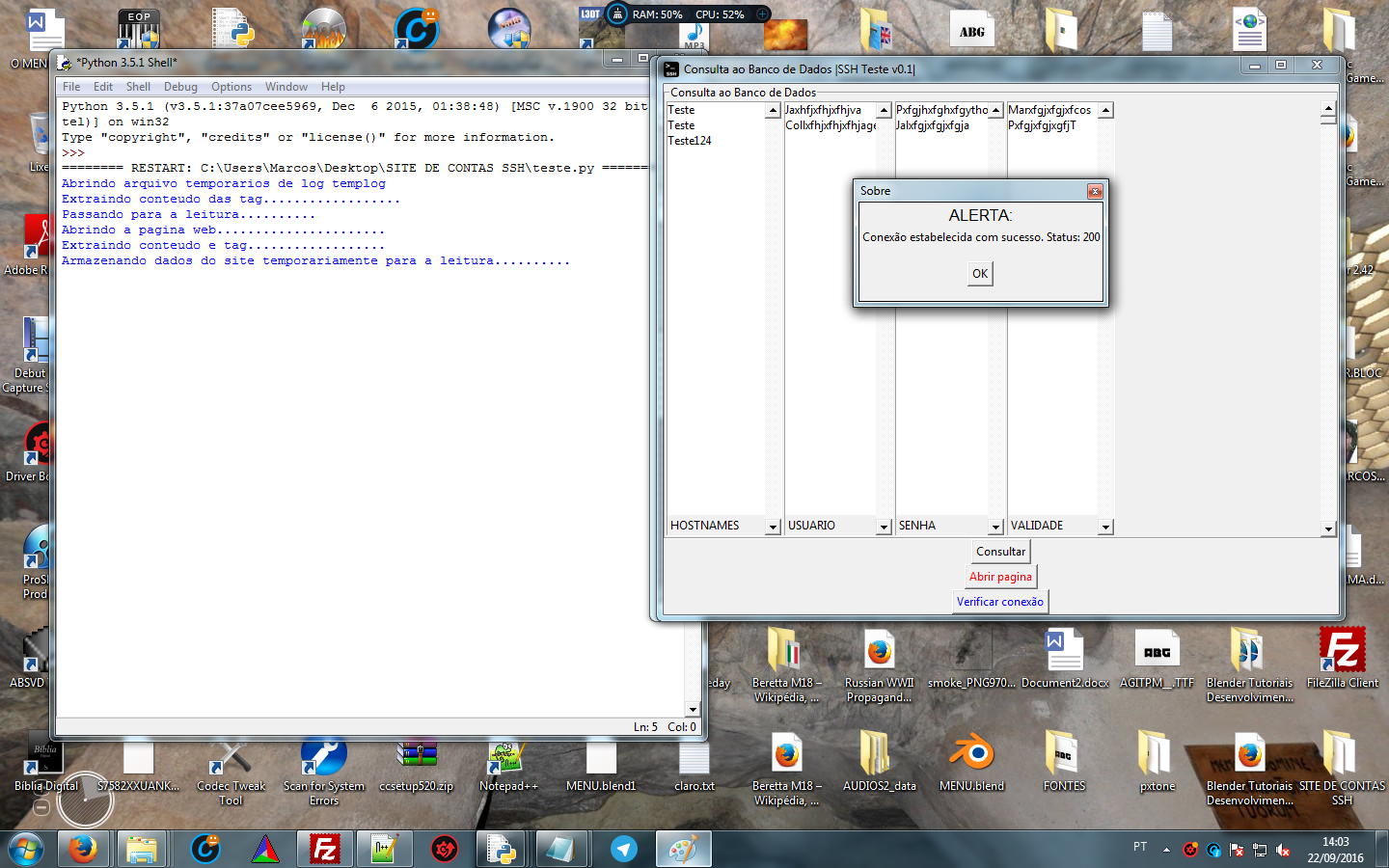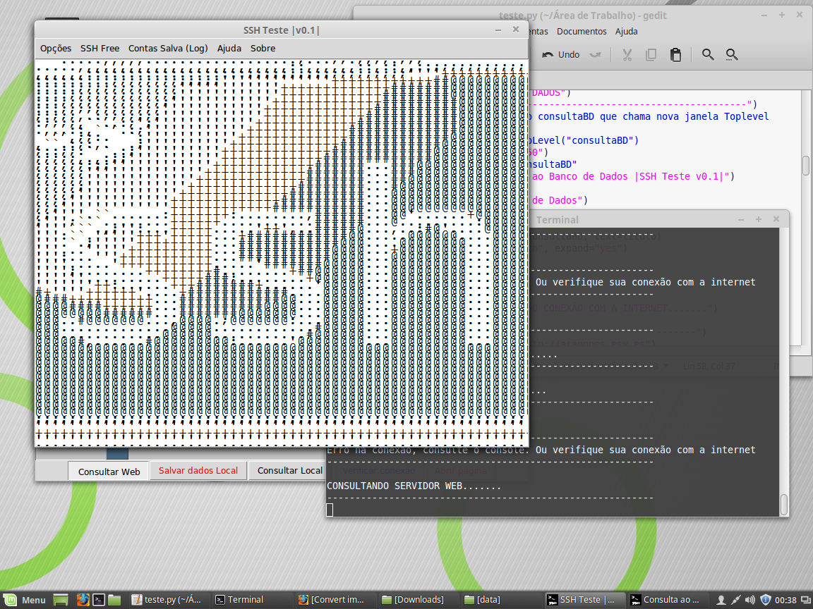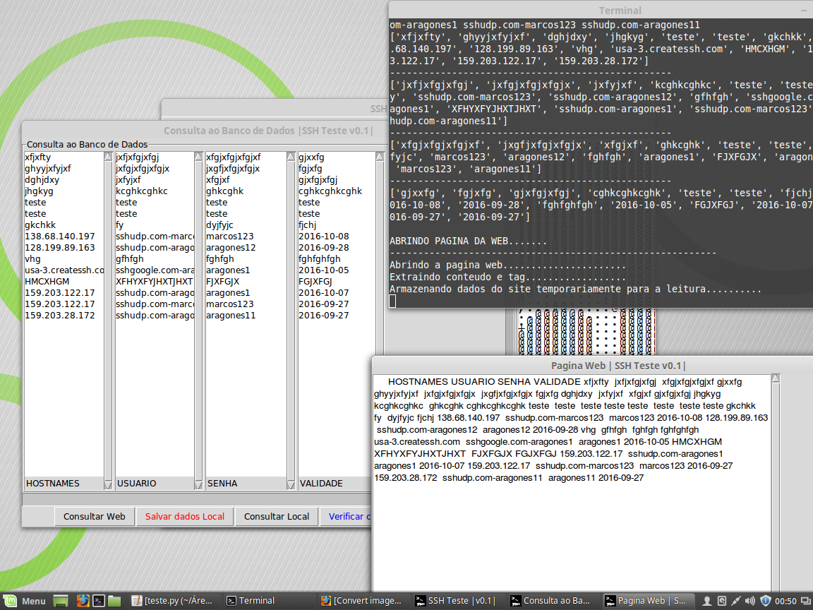 SSH TESTE v0.1, foi desenvolvido para realizar teste em servidores SSH Free, a idéia e foco foram de apenas criação de uma aplicação destinada a console, porém resolvir fazer uma aplicação orientada a objeto, usando a biblioteca Tkinter do próprio Python. Incluir novas funcionalidade como realizar a verificação da pagina onde se encontra os banco de dados aberto e extração dos dados usando a biblioteca HTML Parser..