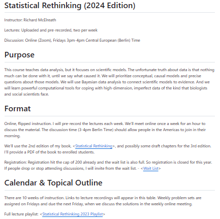 The 2024 repository is the most recent version of the course, reflecting ongoing refinements in pedagogy, statistical modeling techniques, and coding practices. It provides updated notebooks, R scripts, and model examples, some streamlined and restructured compared to previous years. The 2024 repo also highlights the transition toward more robust Stan models and integration with newer Bayesian workflow practices, continuing to emphasize accessibility for learners while modernizing the tools. This version is designed for students following the 2024 lecture series, offering the most current set of examples, exercises, and teaching material aligned with the Statistical Rethinking framework. Online, flipped instruction. I will pre-record the lectures each week. We'll meet online once a week for an hour to discuss the material. The discussion time (3-4pm Berlin Time) should allow people in the Americas to join in their morning.